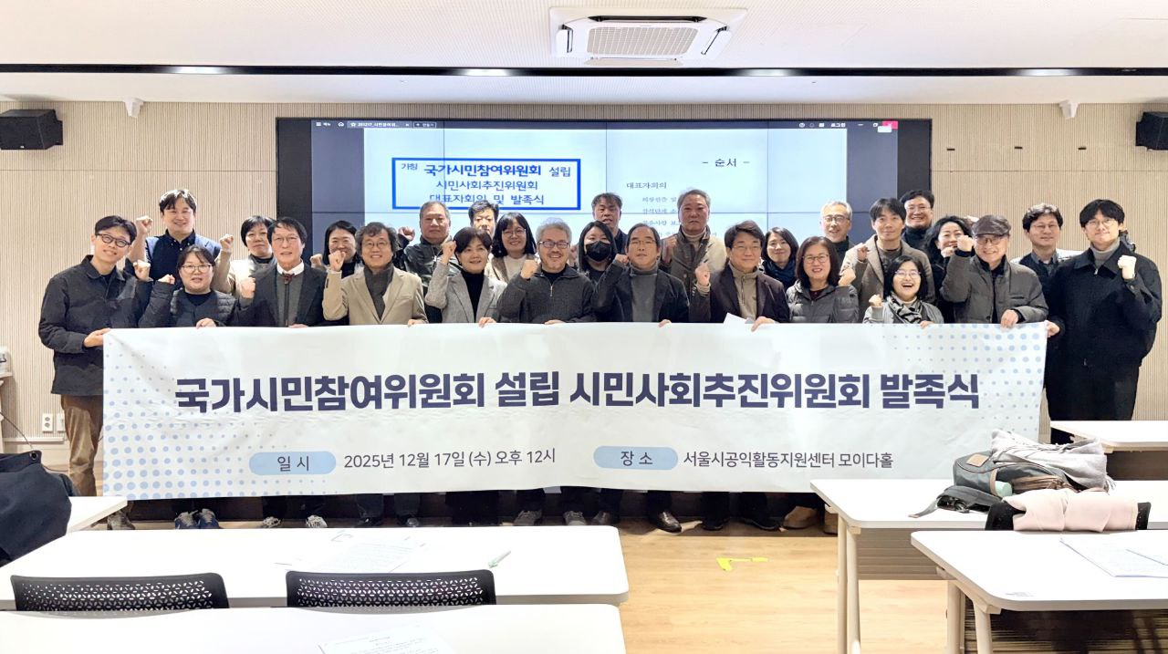 '국가시민참여위원회 설립 시민사회추진위원회(이하 추진위)'는 12월 17일(수) 낮 12시, 서울시공익활동지원센터 모이다홀에서 전체 대표자회의 및 발족식을 개최했습니다. 이날 추진위는 발족선언문을 통해 "시민이 정책의 형성결정·집행 전 과정에 참여해 영향력을 미칠 수 있는 새로운 사회 시스템을 구축해야 한다"고 선언했습니다. 또한 ▲2025년 12월까지 법안 및 위원회 체계안 확정 ▲2026년 상반기 시민참여기본법 제정 ▲2026년 하반기 위원회 설치를 목표로 하는 구체적인 로드맵을 확정하고 본격적인 활동에 돌입했습니다.