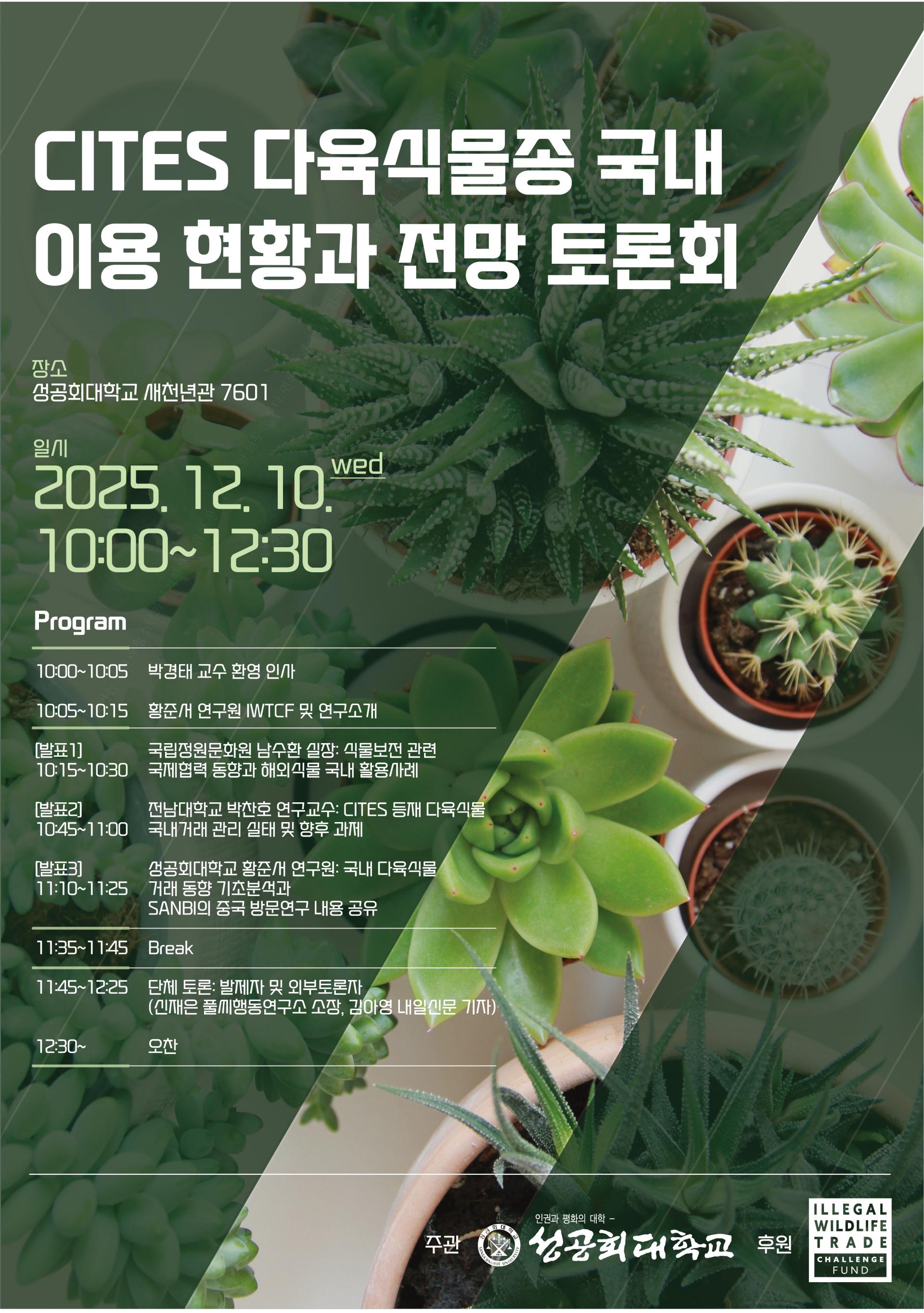 위 질문들에 대한 답을 함께 찾기 위해 성공회대학교는 국내에서 <CITES 다육식물종 국내 이용현황과 전망> 토론회를 개최합니다. 관심 있는 분들의 많은 참여 부탁드립니다.