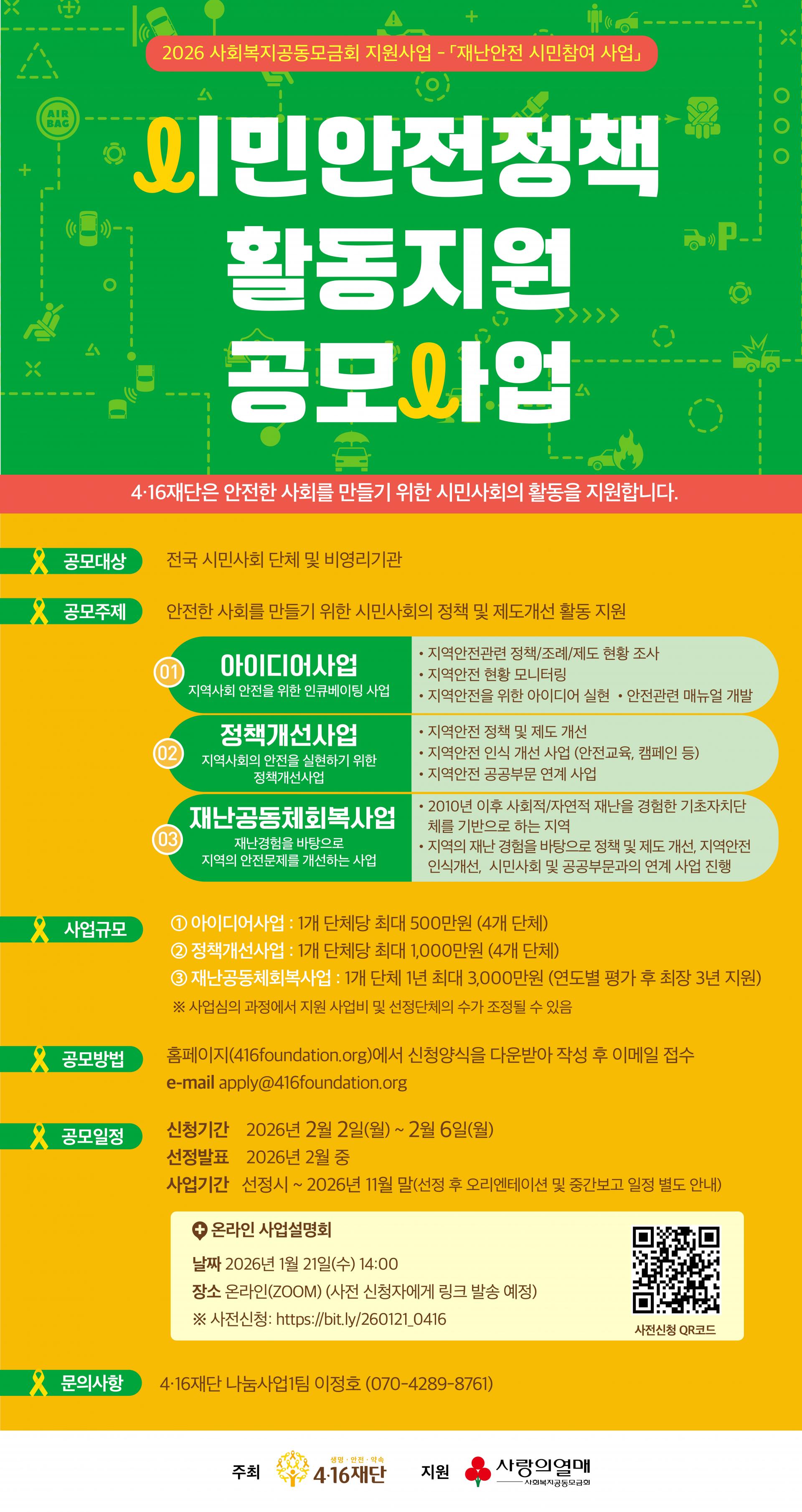 ** 홈페이지 바로가기 : [공모] 시민안전정책 제안활동 지원사업 (2026) – 재단법인 4·16재단