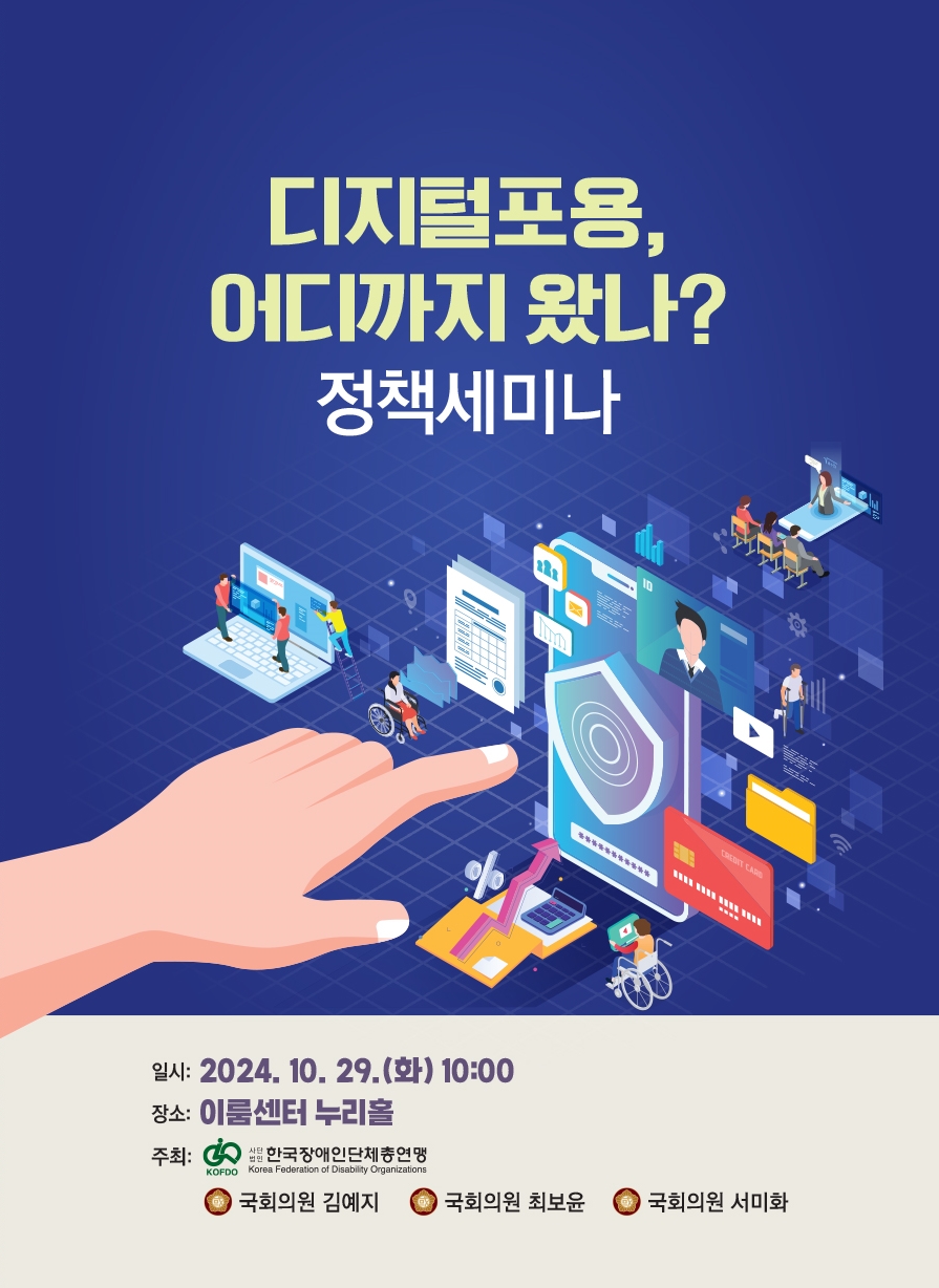 디지털포용의 국내외 현황과 발전 방안을 논의하는 정책세미나가 열린다. 10월 29일(화) 오전 10시부터 이룸센터 누리홀에서 국회의원 김예지, 국회의원 최보윤, 국회의원 서미화, 한국장애인단체총연맹은 ‘디지털포용, 어디까지 왔나?’ 정책세미나를 개최한다.