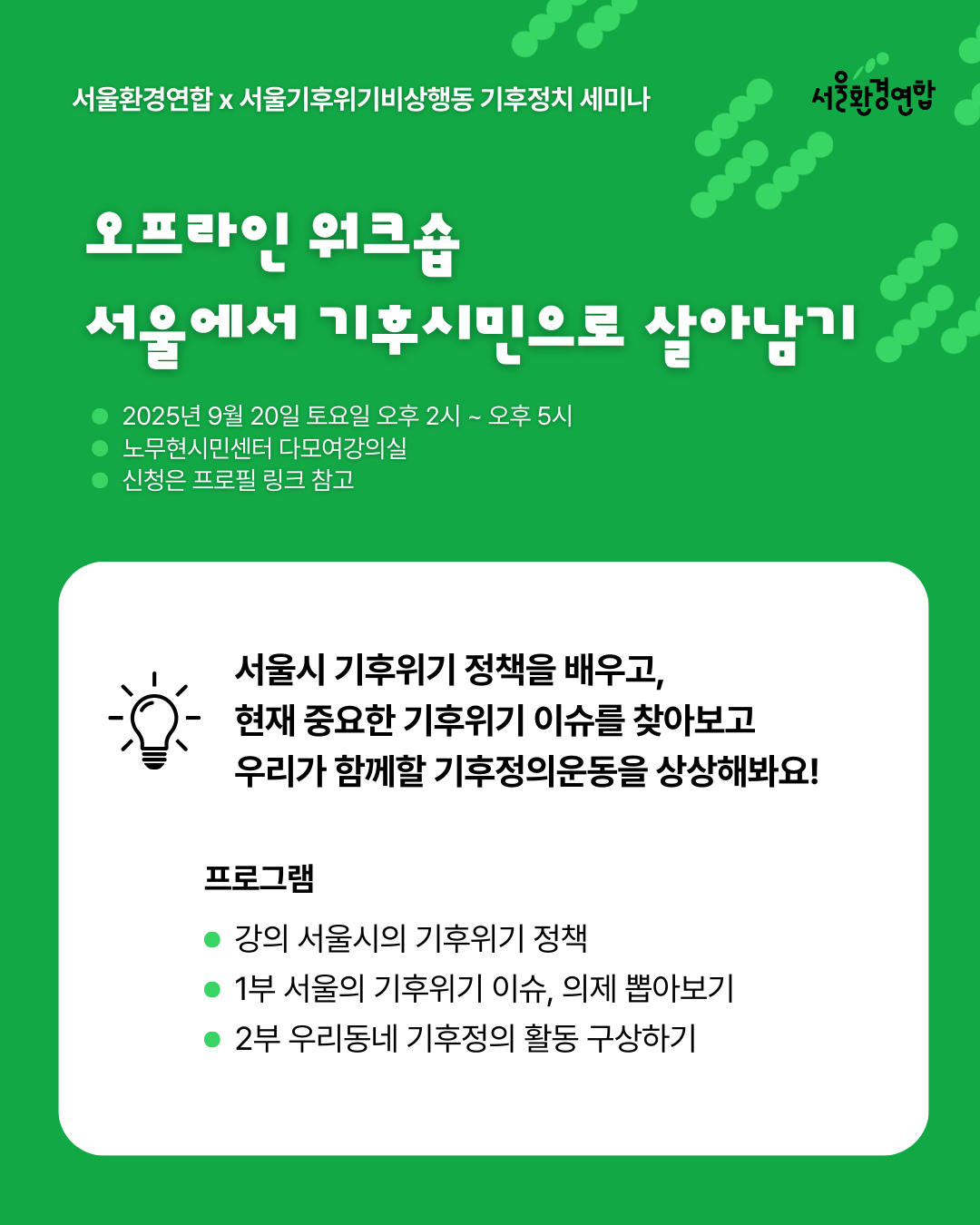 📚 <서울시민 기후위기 생존기> 오프라인 워크숍 ‘서울에서 기후시민으로 살아남기’ 참여자 모집