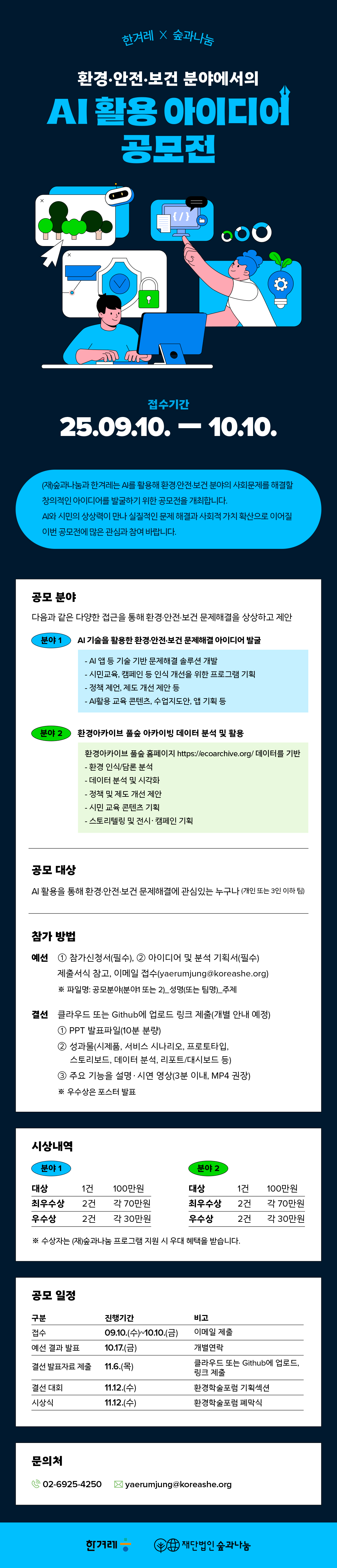 (재)숲과나눔과 한겨레는 AI를 활용해 환경/안전/보건 분야의 사회문제를 해결할 창의적인 아이디어를 발굴하기 위한 공모전을 개최합니다.