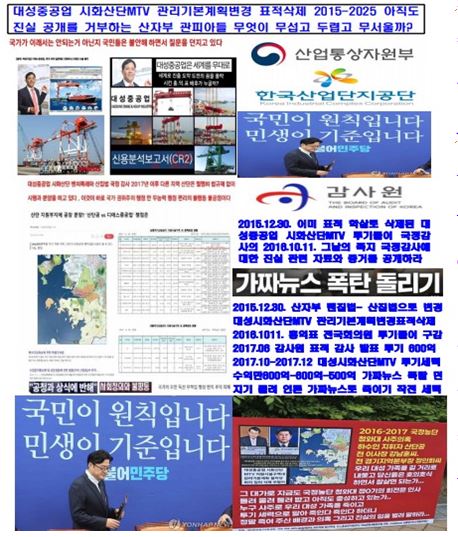 미스터리 일정과 작전으로 (1)2015.12.30. 관리기본계획변경 표적 삭제로 개발 분양 단계에서 공장 등록 불가로 가로 막힌 희안한 사건 - (2)2015.12.30. 표적 학살한 사건을 2016.10.11. 국정감사장에서 쪽지 표적 감사로 이미 죽어 아무런 이해 관계도 아무런 이해 득실도 없는 대성시화산단MTV 개발에 대하여 투기세력 투기 몰이로 근거 공개 못하고 비공개로 버티면서 감사원 고발을 독촉하여 - (3)2017.06 감사원이 표적감사로 다시 투기세력으로 몰아 발표하더니 - (4)기레기 언론들이 기다렸다는 듯이 대성중공업 시화산단MTV가 투기로 800억.600억. 550억 이득을 보았다고 12건 기사를 84건으로 투기 기사로 확대하여 가짜뉴스 폭탄 던지기 돌리기 방식으로 인터넷으로 퍼트린 사실 - (5)2015.12-2025.09 산자부.국토부.산단공.경기도.시흥시는 대성중공업 시화산단MTV 표적학살에 대한 사실 관계 심의 논의 절차 행정 생산문서에 대하여 목숨걸고 박근혜 부패정권의 배후세력 의혹의 정점 문서를 비공개로 아이스 캐비넛에 꽁꽁꽁 숨기고 있다