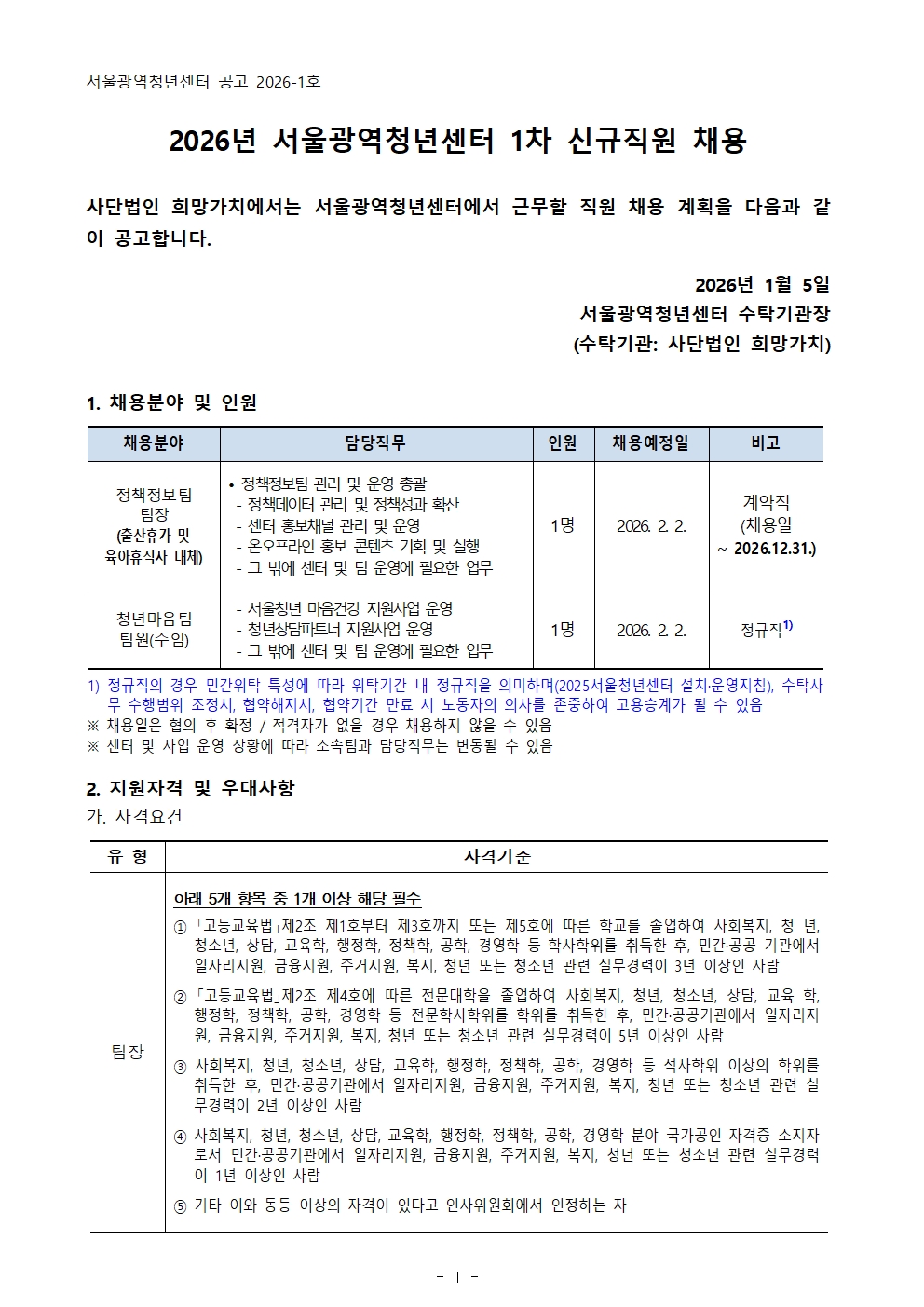 (~1/20) [서울광역청년센터] 정책정보팀 팀장, 청년마음팀 팀원(주임) 채용